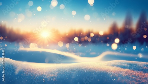 glare bokeh on winter sunset snowy landscape background glittering blue cold airy panorama illustration