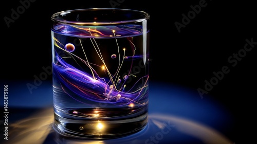Glass Beaker with Neon-Colored Liquid Reacting and Bubble Trails Rising