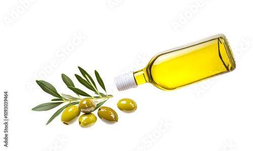 Glass bottle pouring olive oil isolated on white background