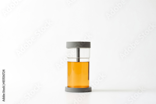 Glass Bottle with Amber Liquid and Gray Lid on White Background