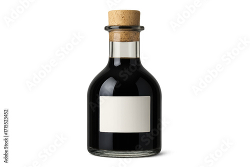 Glass bottle with blank label holding dark liquid and cork on transparent background