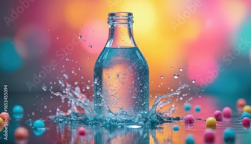 Glass bottle with clear liquid splashing vigorously. Water droplets fly around a vibrant bokeh background with colorful balls. Captures a feeling of refreshment, fun, and energy.