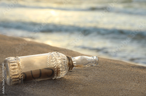 Glass bottle with SOS message on sand near sea, closeup