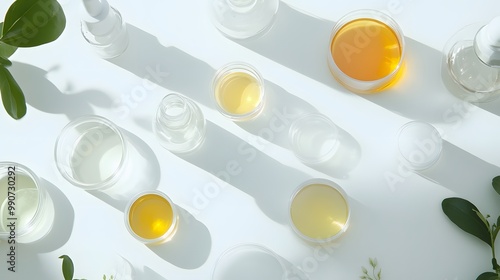 Glass Bottles and Jars with Liquids and Green Foliage on White Surface