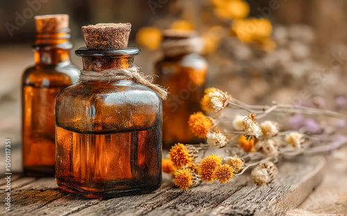 glass bottles of essential oils, dried flowers scattered nearby.