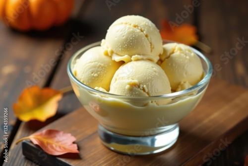 Glass bowl filled with creamy white pumpkin ice cream placed on a wooden table with a few fallen leaves around it, table, earthy, glass