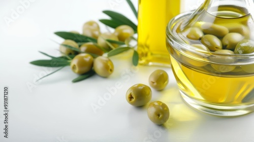 Glass bowls with olive oil on white background