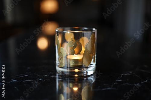 Glass candle holder with decorative leaves illuminating a warm glow on a dark marble surface, creating a cozy and inviting atmosphere for relaxation and tranquility