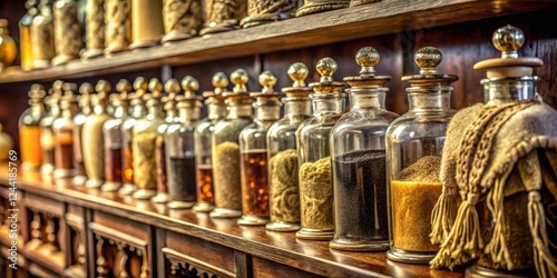 Glass Containers with Various Spices Displayed on a Wooden Shelf