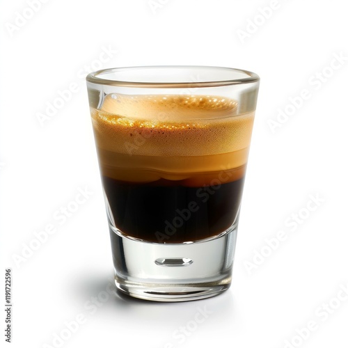 Glass cup containing layered espresso coffee with crema, isolated on a white background, representing a perfect extraction