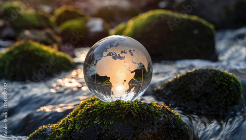 Glass Earth Globe in Flowing River Symbolizing Environmental Sustainability