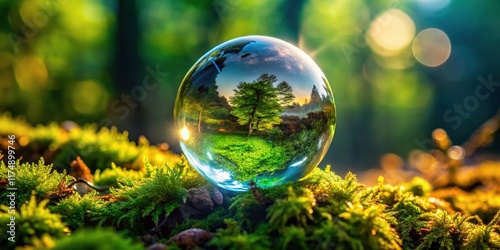 Glass Earth Sphere on Lush Moss: Macro Aerial View, Interconnected Nature