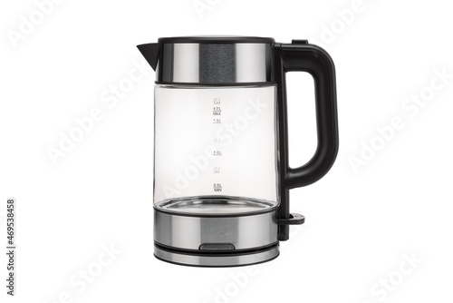Glass, electric, modern transparent kettle on a white background. Close-up.