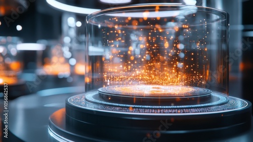 Glass Enclosure Containing Glowing Orange Particles on a Futuristic Platform