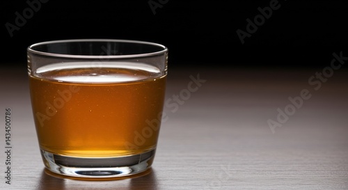 Glass filled with amber liquid on a wooden surface against a dark background.