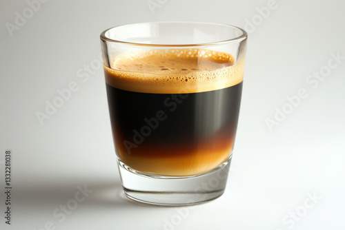 Glass filled with black coffee sits next to a half-filled milk pitcher on a wooden table. Sunlight casts warm shadows on the scene, creating a cozy atmosphere.