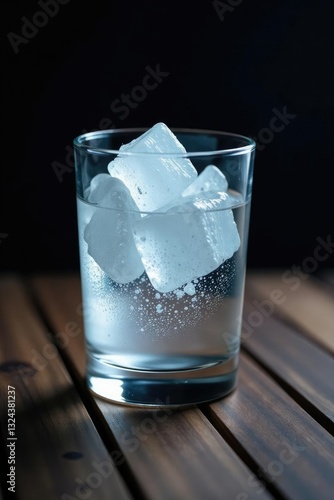 Glass filled with ice sits next to dark wooden planks, single object, silence
