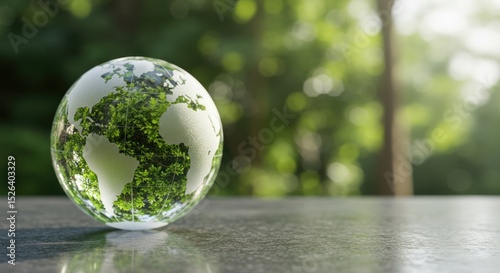 Glass globe with greenery inside sits on a surface with blurred green background.