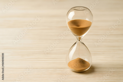 Glass hourglass with running sand on light wooden background, symbol of passing time, deadline pressure, countdown or patience concept, vintage timer for productivity, life, business, or time manageme