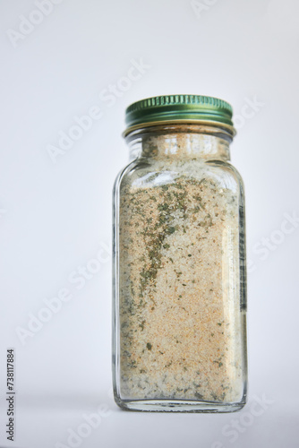 Glass jar with loose dried mixture close-up. Using reusable, recyclable Eco-friendly packaging in everyday life. Organic Seasoning Blend mix. Gray background.