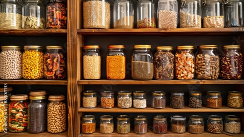 Glass Jars Filled with Dried Goods on Wooden Shelves.