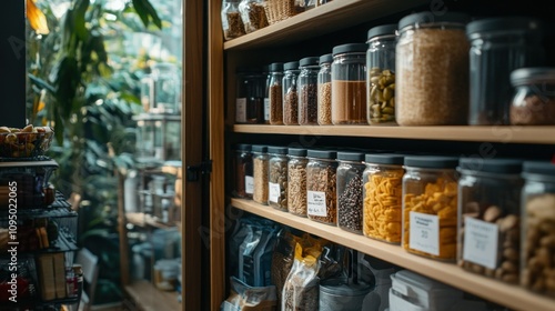 Glass Jars Filled with Various Dried Foods on Wooden Shelves