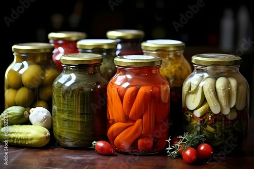 Glass jars with various pickled vegetables include cucumbers, tomatoes and cabbage