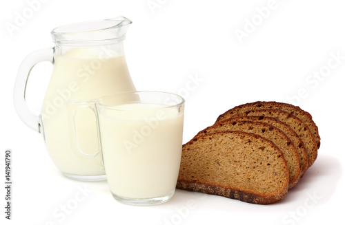 Glass jug pitcher of fresh milk with glass and bread isolated on white background carafe