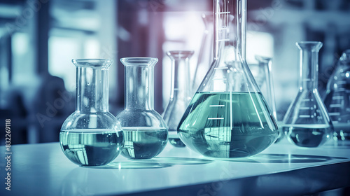 Glass laboratory flasks filled with liquid on a table, illuminated by bright light, in a scientific research environment