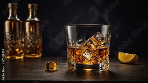 Glass of amber-colored whiskey or bourbon with ice cubes, on dark wooden surface with bottle in background