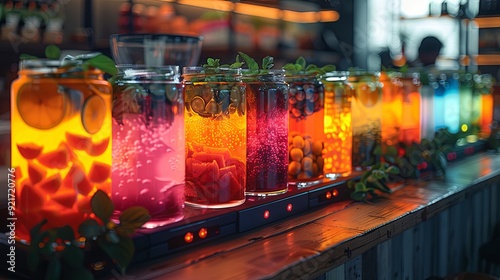 glass of beer on bar counter A high-tech smoothie stand with robotic mixers