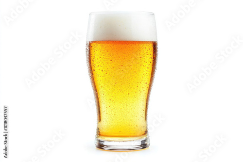 Glass of beer on white background, condensation dripping, bubbles rising.