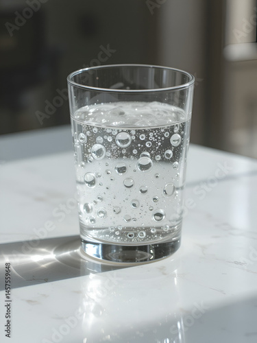 Glass Of Clear Water With Subtle Bubbles Resting on A White Table
