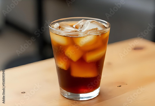 Glass of cold brew coffee with large ice cubes, condensation on the glass, placed on a wooden table with minimal background. Captured with natural light, ideal for modern café or lifestyle visuals.