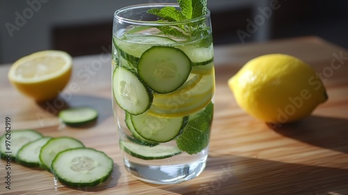 Glass of cucumber and lemon water with fresh mint on a wooden table.