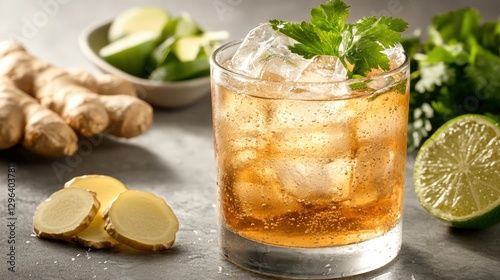 Glass of iced drink with lime and ginger on wooden table in natural light