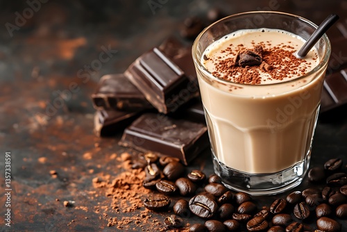 Glass of Irish Cream Baileys Liqueur With Coffee Beans and Dark Chocolate