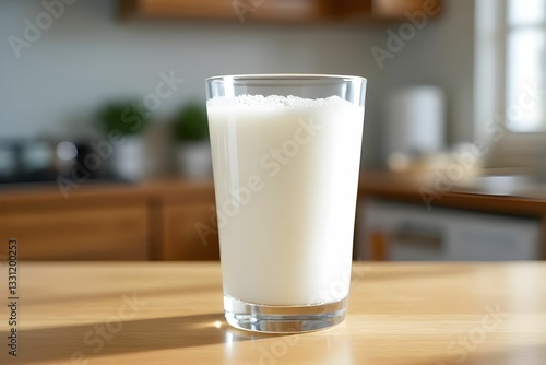 Glass of milk on wooden table with kitchen background. Background for food, drink and product. Product mock up design
