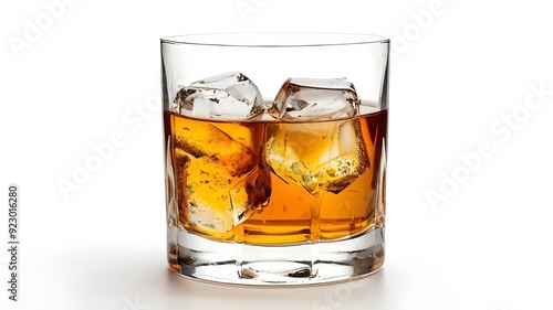 Glass of scotch whiskey and ice on a white background