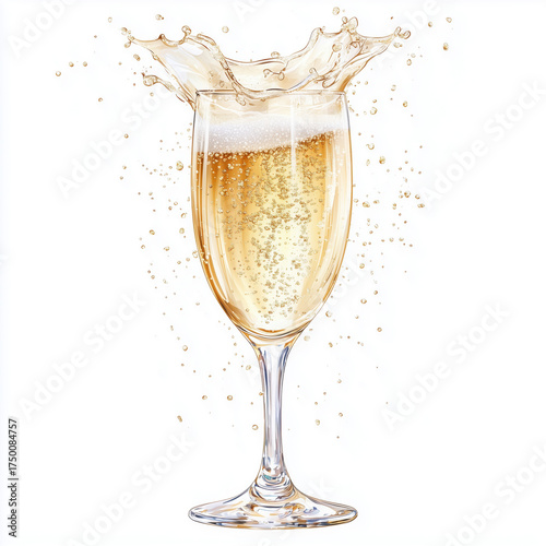 Glass of sparkling champagne with a splash effect, isolated on a white background.
