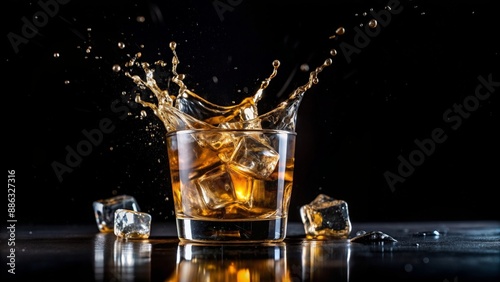 Glass of splashing whiskey with ice cube isolated on black background , Whiskey, alcohol, glass, drink, beverage, ice cube