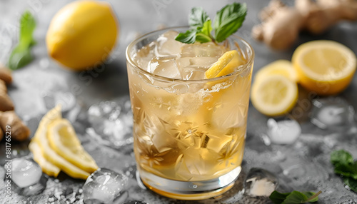 Glass of tasty ginger ale with ice cubes and ingredients on grey table