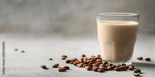 Glass of vegan almond milk on white background with space for text. Concept Food Photography, Vegan Lifestyle, Healthy Drinks, Minimalistic Design, Dairy Alternatives