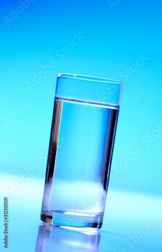 Glass of water on blue background