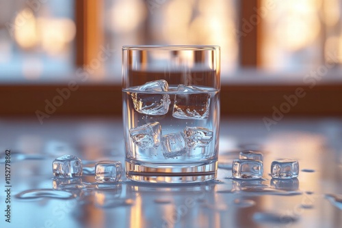 Glass of Water with Ice Cubes on a Reflective Surface