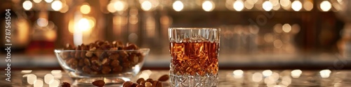 Glass of whiskey in a crystal glass. Bowl of nuts. Bokeh lights in the background.
