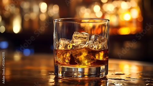 Glass of Whiskey with Ice on Bar