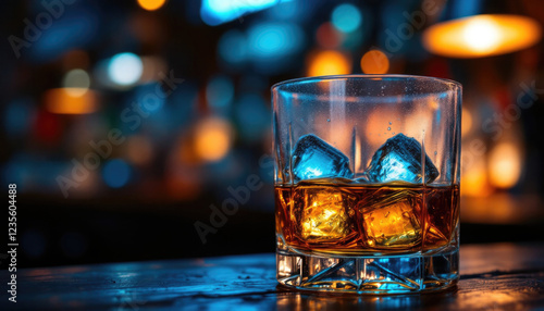 Glass of whiskey with ice on bar counter in warm ambient lighting