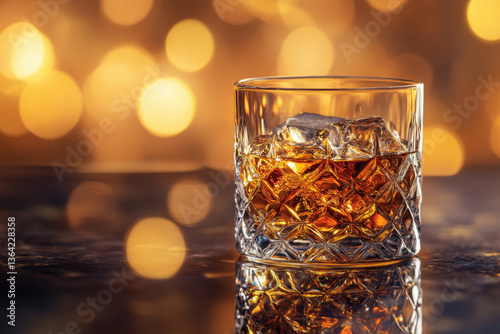 Glass of whiskey with ice on table.