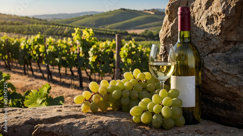 Glass of white wine rests on stone amongst ripe grapes, with with blank label on bottle of wine, vineyard in background